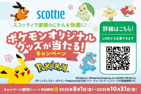 日本製紙グループの日本製紙クレシア株式会社〔住所:東京都千代田区神田駿河台4-6、代表取締役社長:安永敦美〕は、昨年もご好評いただいた『ポケットモンスター』とのオリジナルデザインの「スコッティ ティシュー フラワーボックス 250組 3箱パック/5箱パック ポケモン」、「スコッティ ファイン ペーパーふきん サッとサッと/3コパック ポケモン」、「スコッティ ウェットティシュー 除菌アルコールタイプ 120枚/除菌 ノンアルコールタイプ 120枚 ポケモン」の計6種を2025年8月1日(金)より発売致します。あわせて、2025年8月1日(金)~2025年10月31日(金)までスコッティ商品を買ってポケモンオリジナルグッズが抽選で当たる「スコッティで家族のじかんを快適に!ポケモンオリジナルグッズが当たる!キャンペーン」を実施します。