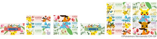 「スコッティ ティシュー フラワーボックス」に、2025年10月16日(木)発売の『Pokemon LEGENDS Z-A(ゼットエー)』に登場する主人公が最初に選ぶポケモン「チコリータ」「ポカブ」「ワニノコ」と「ピカチュウ」「イーブイ」をデザインしました。各ボックスのイメージ色にあわせて、花に乗ったポケモンの「フラベベ」とおなじみのポケモンたちを配し、反対側の面には笑顔のポケモンたちがアップで描かれたデザインにしています。