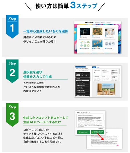 日本語でイメージを入力するだけで、ChatGPT・Gemini・Adobe Firefly・Copilotなどの主要AIに対応した最適なプロンプトを生成可能。