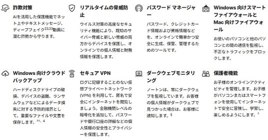 最大3台のWindows、Mac、Android、iOSデバイスに対応し、マルウェア対策、セキュアVPN、保護者機能、WindowsのWebカメラ保護機能(セーフカム)、パスワードマネージャー、Windows向けクラウドバックアップなどを搭載しています。