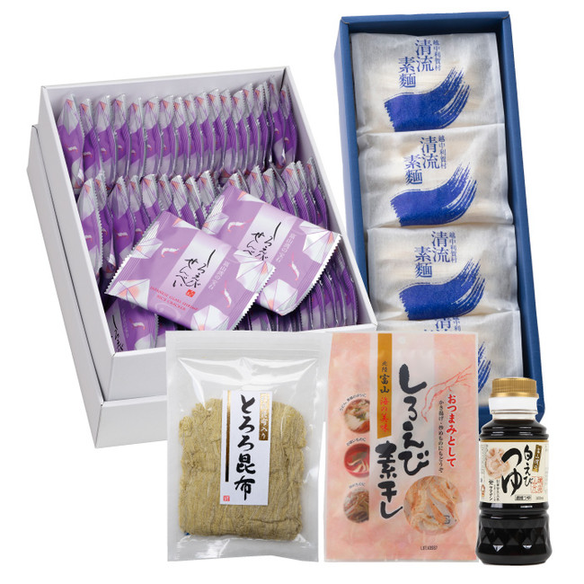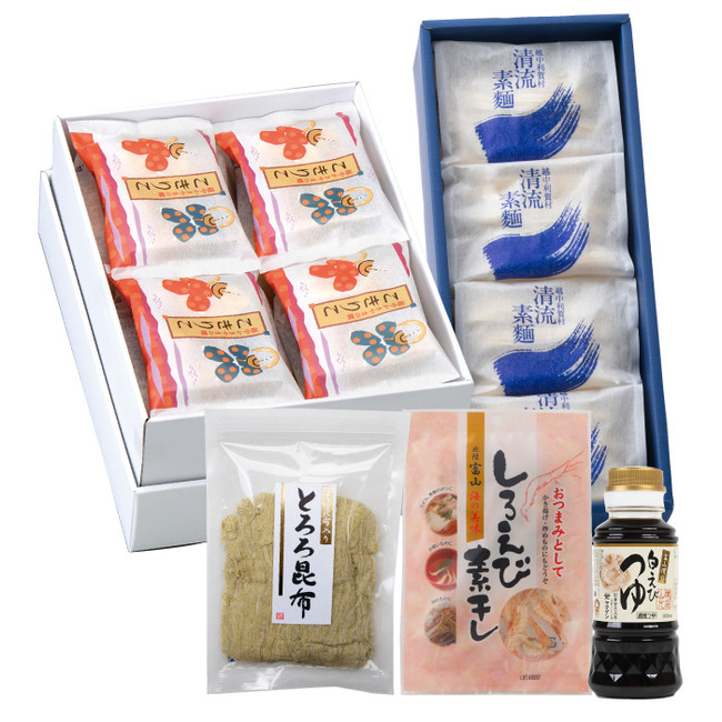 「日本海の幸と清流素麺のセット」は、富山県南砺市利賀村で作られる「手延素麺の至高の逸品」と呼ばれる清流素麺をより楽しんでいただくために、しろえびの濃厚な風味が楽しめる「しろえび素干し」と北海道産の最高級の利尻昆布を使用した「とろろ昆布」、そしてささら屋の人気の米菓商品がセットになっています。