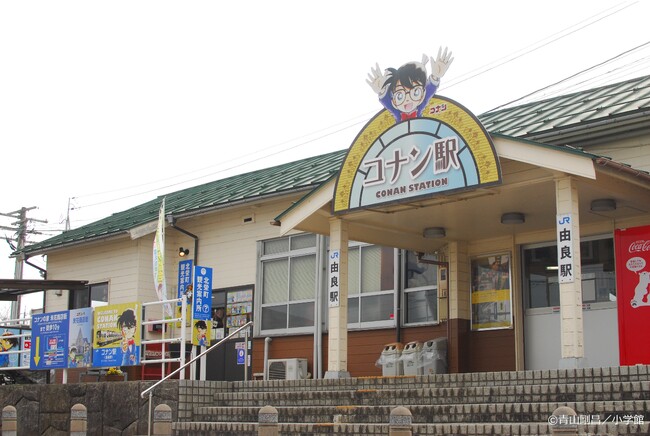 青山剛昌先生のふるさとにあるJR由良駅は、2013年12月に愛称「コナン駅」となりました。駅は名探偵コナンの装飾でいっぱい。列車に乗らなくても訪れるだけで楽しい駅です。