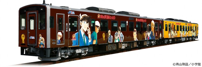 1編成の2車両それぞれに異なるテーマを設けており、米子側になる車両はシックで落ち着いた茶色のベースに、作品に登場する探偵たち(江戸川コナン、工藤新一、毛利小五郎、安室透、服部平次など)が勢ぞろい。鳥取側の車両には、明るいオレンジ色をベースに、コナンの同級生で構成された少年探偵団が描かれています。