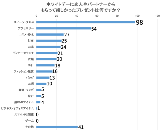 「ホワイトデーに恋人やパートナーからもらって嬉しかったプレゼントは何ですか?」という質問では、「スイーツ・グルメ」が98票を集め、「アクセサリー」54票、「コスメ・香水」24票が続く結果になりました。