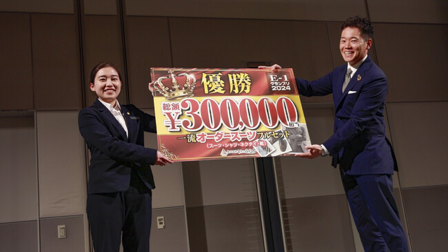 新入社員研修で、高級オーダーメードスーツセットを懸けた買取ロールプレイング「E-1グランプリ」を開催し、いーふらんが展開する「おたからや」の接客技術や商品知識などを披露。E-1グランプリには新入社員研修において優秀な成績を残した3名が競い、グランプリを決定しました。