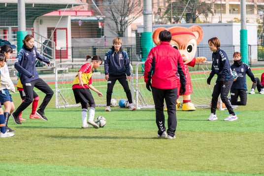 第2回目となる今回は、小学1年生から6年生までの女子生徒35名が参加し、INAC神戸の現役選手20名が指導にあたり、学年ごとの数グループに分かれて基礎的な練習から参加者のレベルに応じた練習を行いました。