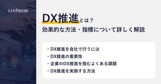 企業向けDX人材育成研修を提供する株式会社リンプレス(本社:東京都港区、代表取締役社長:三宮壮、以下、リンプレス)は、DXに取り組む企業様に向けて、『DX推進とは?効果的な方法・指標について詳しく解説』と題した記事を公開しましたので、お知らせします。