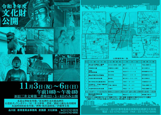 品川区は「文化の日」に合わせて11月3日~6日、普段観ることができない指定文化財を所有者の協力を得て一般公開します。一般公開する指定文化財は6~8カ所。解説パンフレットも配布します。ぜひ、ご覧ください。