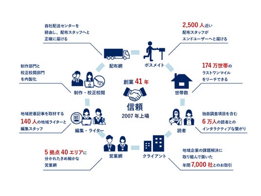 当社は、地域密着型の生活情報誌『ちいき新聞』の発行を軸に、情報発信および販売促進の総合支援事業を展開しており、年間約7,000社にサービスを提供しています。千葉県を中心に毎週発行している『ちいき新聞』は、専属の配布員により174万世帯へポスティングされ、創業以来41年以上にわたり配布を継続してきたことで、他に類を見ない九つのアセットを築いてきました。