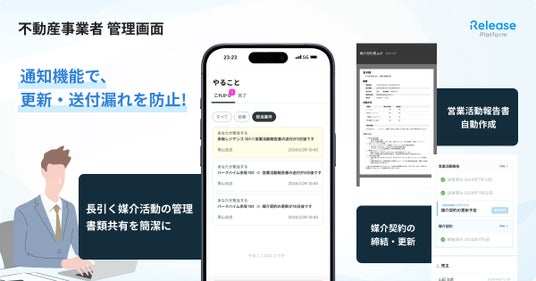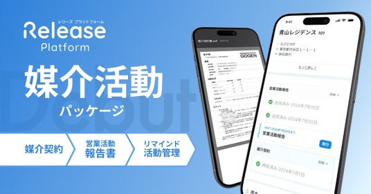レリーズプラットフォームの「媒介活動パッケージ」は、媒介契約の作成から電子契約による締結・更新、営業活動報告書の作成・提出、案件管理や書類のやり取りといった媒介活動に係る一連の手続きをレリーズプラットフォームで完結することができる不動産売買仲介事業者向けのパッケージです。なお本パッケージは、東京建物不動産販売株式会社、野村不動産ソリューションズ株式会社など複数の不動産売買仲介会社においてすでに利用中、または今後の利用を予定しております。
