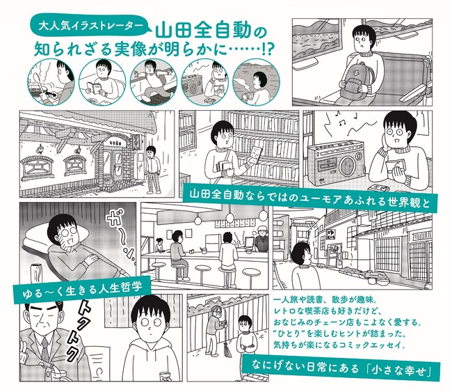 山田全自動ならではのユーモアあふれる世界観とゆる~く生きる人生哲学、なにげない日常にある「小さな幸せ」が描かれています。