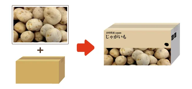 実際の商品写真を元に、ダンボールから商品のイメージが伝わるようにし、ワクワク感を演出するデザイン
