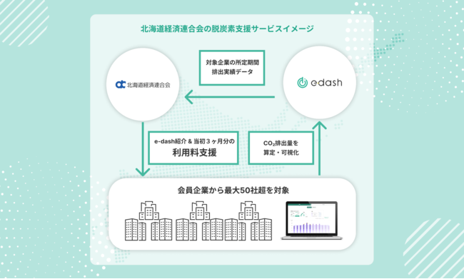 CO2排出量可視化のクラウドサービス「e-dash」を提供するe-dash株式会社(本社:東京都千代田区、代表取締役:山崎冬馬、読み:イーダッシュ、以下「当社」)は、北海道経済連合会(所在地:北海道札幌市中央区、会長:真弓明彦、以下「道経連」)と連携し、道内企業の脱炭素化を支援することを発表します。道経連の会員企業に対して、道経連が3か月分のe-dash利用料を支援し、e-dash利用を通じて道内企業のCO2排出量の可視化と削減を促進します。