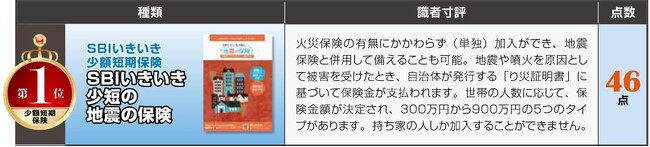 SBIいきいき少額短期保険株式会社(本社:東京都港区、代表取締役社長:新村 光由、以下「当社」)は、株式会社徳間書店(本社:東京都品川区、代表取締役社長:小宮 英行)が2022年12月12日に発刊した『NEWよい保険・悪い保険2023年版』内の少額短期保険(ミニ保険)のランキングにおいて、「SBIいきいき少短の地震の保険」が3年連続で第1位を獲得したことをお知らせします。