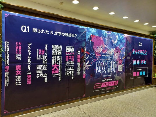 KAMITSUBAKI STUDIOとHELLO OSAKAによるメタバース企画、KAMITSUBAKI STUDIO presents バーチャル謎解きミステリー「魔女謎解(まじょなぞとき・以下魔女謎解)」with HELLO OSAKAの謎解きつき巨大ポスター広告を3月31日(日)まで阪急うめだ本店前のムービングウォーク横に掲出中です。