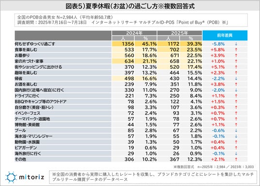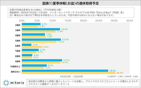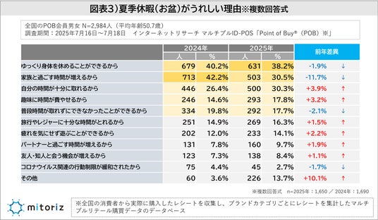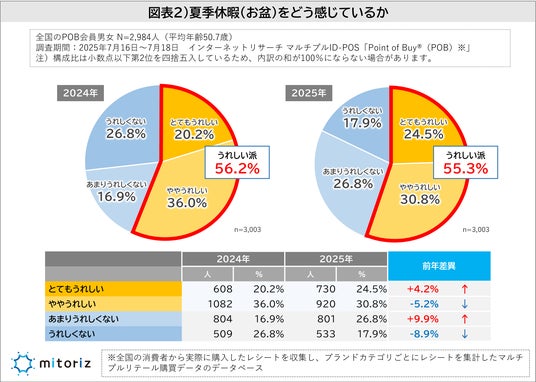 株式会社mitoriz(本社:東京都港区、代表取締役社長:原田光幸)は、消費者購買行動データサービス「Point of Buy(R)(以下、POB)」の会員2,984人を対象に、2024年に引き続き「お盆休み・夏季休暇に関する調査」を実施しました。