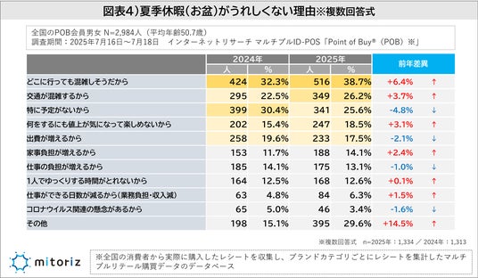 夏季休暇(お盆)について「うれしくない」と回答した人に理由を尋ねたところ、最も多かったのは「どこに行っても混雑しそうだから(38.7%)」、次いで「交通が渋滞するから(26.3%)」となり、上位2項目を“混雑関連”が占める結果となりました。いずれも前年より増加しており、特に「どこに行っても混雑しそうだから」は前年比+6.4ptと大きく上昇しています。コメントでも「インバウンドの増加でどこも混みそう」「宿泊施設が高騰していて予約が取れない」といった声も複数見られ、混雑や価格上昇に対するストレスが、“夏季休暇がうれしくない”と感じる一因となっていると考えられます(図表4)。