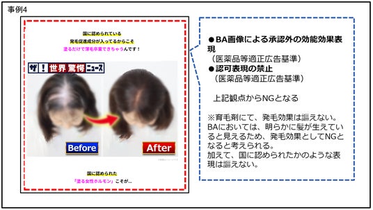 例6:育毛剤において、塗る植毛、誰にもバレずに生やせる、などの表現や、BA画像により、あたかも髪が生えるかのような表現。また白髪が生えてこなくなる、白髪ケア、などの白髪に効果があるかのような表現。