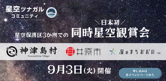 株式会社SHINSEKAI Technologies(本社:東京都渋谷区、代表取締役:大社 武、以下:当社)が提供するコミュニティ関連サービス群「MURA(ムーラ)」にて支援を行う『星空ツナガルコミュニティ』は、リアルイベント第一弾として、9月3日(火)に日本初の「同時星空観賞会」を開催します。このイベントは星空保護区に認定されている東京都神津島村、岡山県井原市、福井県大野市が連携して行われます。