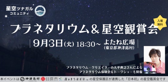 東京都神津島村では、星空観賞会に加えて、プラネタリウム・クリエイターの大平貴之さんをお招きして一夜限りのプラネタリウム体験&トークショーを合わせて開催いたします。