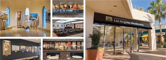 (左上)富士五湖アカデメイアのキャンパス、 (中央・下段)国内4都市のキャンパスから抜粋、(右)カリフォルニア州・アーバインにあるロサンゼルス・アカデメイアのキャンパス