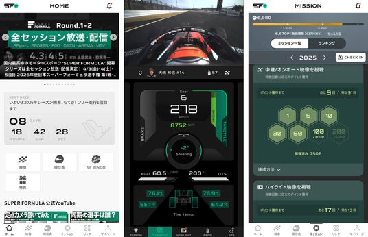JRPが提供する『SFgo』は、SUPER FORMULAをより深く楽しめる公式アプリです。今後『SFgo』では、“アジアモータースポーツ界最大のデジタルエンターテイメント”を目指し、AR/VRを取り入れた視聴体験やAIを利用したレース分析など、日本最高峰のレースを多面的に楽しめる機能をさらに充実させていく予定です。
