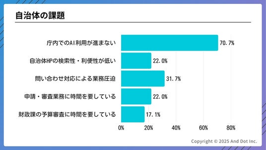アンケートにより70.7%の職員が「庁内でのAI活用推進がなかなか進まない。利用されない」という課題を認識しており、生成AIの「導入」後の「浸透」と「実務での定着」が自治体DXの最大の障壁となっている現状が判明しました。