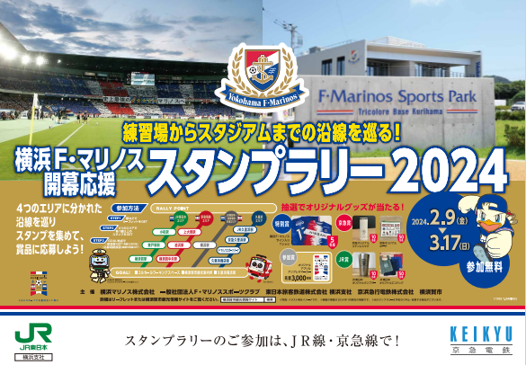 この度、横浜マリノス株式会社(代表取締役社長:中山昭宏)、一般社団法人 F・マリノススポー ツクラブ(代表理事:宮本功)、東日本旅客鉄道株式会社 横浜支社(執行役員横浜支社長:宮田久嗣)、京浜急行電鉄株式会社(取締役社長:川俣幸宏)、横須賀市(市長:上地克明)は、2024J リーグの開幕に先駆け、練習場からスタジアムまでの沿線を巡る!「横浜 F・マリノス開幕応援 スタンプラリー 2024」を開催します。
