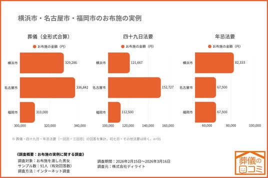 株式会社ディライト(本社:東京都新宿区、代表取締役:高橋 亮)は2026年3月20日、神奈川県横浜市・愛知県名古屋市・福岡県福岡市の3都市において、実際に支払われたお布施の金額データ91件を公開しました。