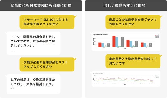 当社ブースでは、属人化された業務の平準化や、予測に基づく在庫最適化を実現する「AIチャット」と「ダッシュボード」の2つのツールを紹介します。