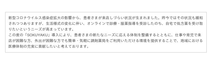 今後も、「SOKUYAKU」では、患者、医療機関、調剤薬局の利便性向上に貢献するための取り組みを進めてまいります。