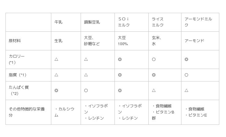 ・カロリー: SOiミルク 39kcal 調製豆乳 64kcal