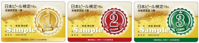 合格者には後日、合格認定証(カード型)を進呈します。デザインは躍動的なビールの液体を背景に、ビールの王冠をイメージした級別のエンブレムを配置しています。