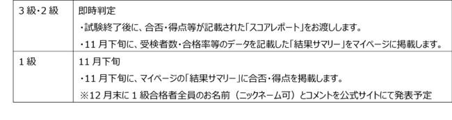 ・1級は“同日同時刻一斉開催“で、全受検者に同じ問題を出題します。問題及び解答は受検日翌日の10月23日(月)に、公式サイトの1級受検者専用ページで限定公開します。