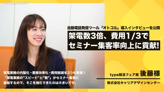 「就職の本質を考える」を掲げて、企業と学生をサポートしているtype就活(運営:株式会社キャリアデザインセンター)。企業セミナーの運営も請け負っている同社の就活フェア局では、参加学生へのリマインド架電を強化をするためにオトコルを導入いただきました。結果、適切なリマインド架電によって参加するまでのユーザー体験が向上し、セミナーの集客率も上がったという導入効果を挙げています。