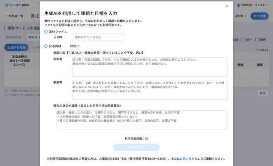 介護や医療の利用者のプロフィールを記載した「フェイスシート」から「ケアプラン(居宅サービス計画書)」の課題と目標の文章生成が可能となりました。