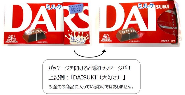 「ダース<ミルク>」、「ダース<甘さ控えめミルク>」、「白いダース」、「白いダース<ザクザクブラック>」4商品のパッケージには、通常パッケージの商品に加えて、パッケージの蓋を開けると、つい誰かに言いたくなるような、可愛く元気が出る隠れメッセージが入ったパッケージの商品も展開予定です。