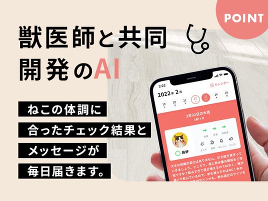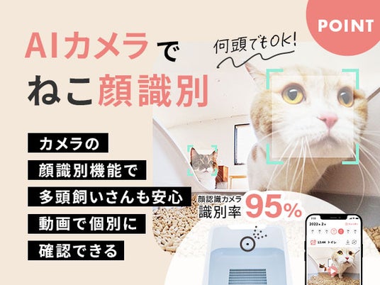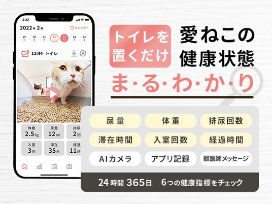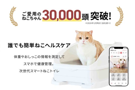 累計利用頭数が30,000頭を超えた、最新のIoT技術搭載の猫用システムトイレ「トレッタ」。猫にストレスをかけることなく24時間365日、体重や尿のデータを計測し、就寝中や不在時でも猫の体調を見守ることができる純国産の猫用トイレです。微細な重量の変化を感じ取るセンサーで、体重はもちろん、入室から退室までの重量変化などから尿量、尿の回数、入室の回数、滞在時間、前回からの経過時間を測定。世界初のAIねこ顔認識技術(日本・中国・米国の特許取得)を用いて、首輪や専用のタグなしの個体識別を可能にしました。