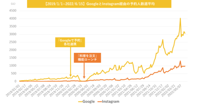 一方、予約比率が増加しているのが、公式ウェブ予約とGoogle、Instagramです。公式ウェブ予約の比率はコロナ前は40%強で推移していましたが、直近ではその比率を50%前後まで上昇させています。Google、Instagram両社は、コロナ禍で飲食店予約機能を充実させて以降、いずれも予約数を急速に伸ばしています。全体的な割合としては両社合わせて5%ほどと、まだ低い割合ですが、グルメサイト離れが進む昨今、この割合は今後さらに急増していくと考えられます。