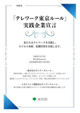 株式会社manebi(東京都千代田区 代表取締役執行役員CEO:田島 智也 以下、manebi)は、東京都が提唱する「テレワーク東京ルール」実践企業に認定されましたことをお知らせいたします。