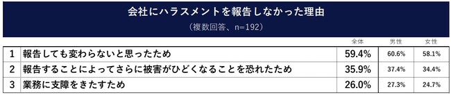 続いて、「報告しなかった」と回答した方に、なぜ会社に報告しなかったのか、その理由を聞いたところ、「報告しても変わらないと思ったため」が59.4%で、2位の「報告することによってさらに被害がひどくなることを恐れたため」35.9%と、大きな差がありました。どうやらハラスメントを受けた多くの方が、“最初から諦めてしまっている”ようです。