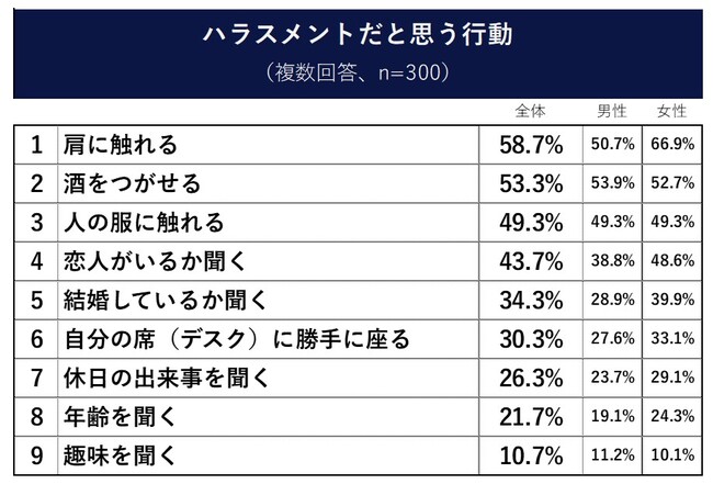 ではどんな行動が”ハラスメント”にあたるのでしょうか。その内訳を聞いてみると「肩に触れる」が58.7%、「酒をつがせる」が53.3%、「人の服に触れる」が49.3%と続きました。