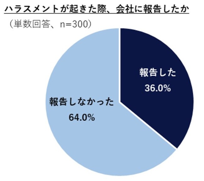 ハラスメントが起きた際、会社に報告したか聞いたところ、報告したと回答したのは36.0%で、残りの64.0%が