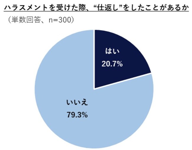 ハラスメントを受けた際、「会社は何もしてくれなかった」という回答が多く集まりましたが、ハラスメントを受けた本人が、直接“仕返し”をしたことがあるかを聞いたところ、「はい」と回答したのは20.7%でした。