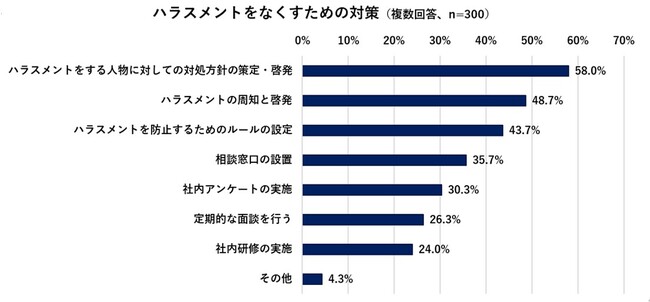 ではハラスメントをなくすために、会社側は何をすべきなのでしょうか。その対策方法を聞いたところ、「ハラスメントをする人物に対しての対処方針の策定・啓発」が58.0%、「ハラスメントの周知と啓発」が48.7%、「ハラスメントを防止するためのルールの設定」が43.7%と続きました。