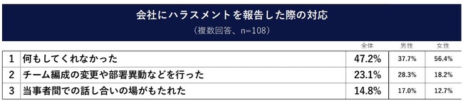 では「報告した」と回答した方に、会社はどのような対応をしたのか聞いてみると、「何もしてくれなかった」が最も多く47.2%という結果になりました。男女別でみると、男性が37.7%なのに対し、女性は56.4%と、女性側が訴えた”ハラスメント”に対して、“会社は何もしてくれない”という傾向が高く出ました。
