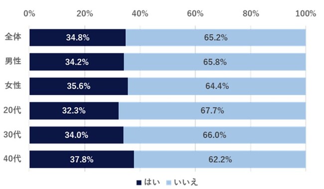 はじめに、全国の従業員数10名以上の企業に勤める20歳~49歳の男女に、職場でハラスメントを受けたことがあるか聞いたところ、34.8%の方がなんらかのハラスメントを受けたことがあると回答しました。男女別でみると男性が34.2%、女性が35.6%、ハラスメントを受けたと回答し、性別での違いはあまり見られませんでした。しかし年代別で見ると、20代が32.3%、30代が34.0%、40代が37.8%と、年齢を重ねることで、ややハラスメントを受けたことがある方が多くなる傾向が見られました。これは、年齢を重ねることでハラスメントに遭遇する機会が増えたからとも言えますが、ハラスメントの意識は以前よりかなり高くなっています。そのことで若い世代がハラスメントを受ける機会がやや減少傾向にあるのかもしれません。