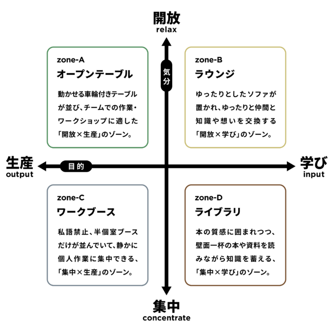 仕事における「モード」を抽象化し、リラックスと集中、インプットとアウトプットという「2つのモード軸」を設定。それぞれのモードにあわせた空間にしました。インプットとアウトプットモード、集中と開放モードを緩やかに移行できるゾーン設計にしています。