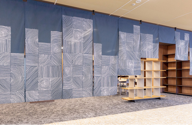 長さ14メートルの特注暖簾は、「コレド室町」や「とらや 東京ミッドタウン店」などの暖簾を製作している有限会社中むらに依頼しました。商売の象徴としてだけではなく、各ゾーンを分断せずに緩やかに繋げるという空間デザインにも暖簾が一役買っています。