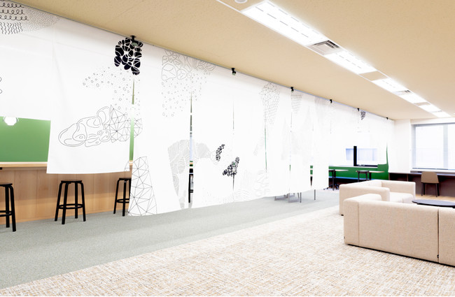 heyはお商売のデジタル化を支援する「STORES プラットフォーム」を通じて、中小事業者のお商売にまつわる課題を解決し、こだわりや情熱、たのしみによって駆動される経済の発展を目指しています。オフィス内には、「STORES プラットフォーム」を利用するオーナーさんの商売繁盛を願う気持ちを込めて、商売の象徴として暖簾を設置しました。